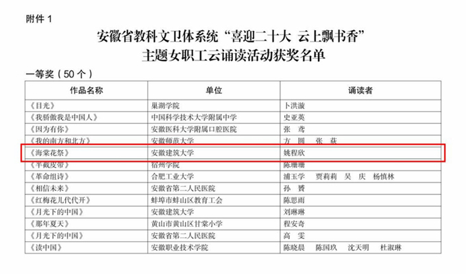 本网讯  为深入学习宣传贯彻习近平新时代中国特色社会主义思想,展示广大女职工的新时代风采和健康向上的精神风貌,营造喜迎二十大的浓厚氛围,省教科文卫体工会结合第27个“世界读书日”,开展“喜迎二十大 云上飘书香”主题女职工云诵读活动。建筑与规划学院姚程欣老师以《海棠花祭》荣获一等奖。