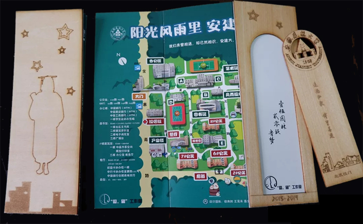 2022届建规学院毕业礼物是“印花暗号”模型摆件。从北区报到、皖南写生、60里毅行、模型搭建、实体建造、乔迁校区、疫情防控、专业学习、电脑绘图、毕业离校,用钢笔线条勾勒出属于建规的独家记忆。旋转的片墙映射求学生涯不断进步的阶梯,永恒的印记是徽匠永远不变的初心,建筑的剪影留下大学的足迹,徽派的花窗是过去、现在、未来跨越时空的情怀,蓝黄的配色是建大蓝遇到工科黄的浪漫,随着绘图纸的泛黄、马克笔的褪色、双面胶的失效,逐渐在记忆中淡去,每一个成长的印记,都献给最好的自己,以梦为马,不负韶华。