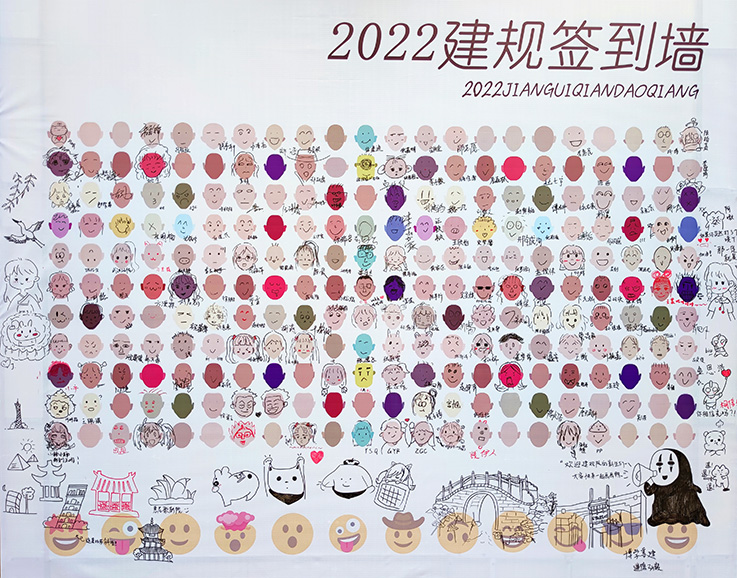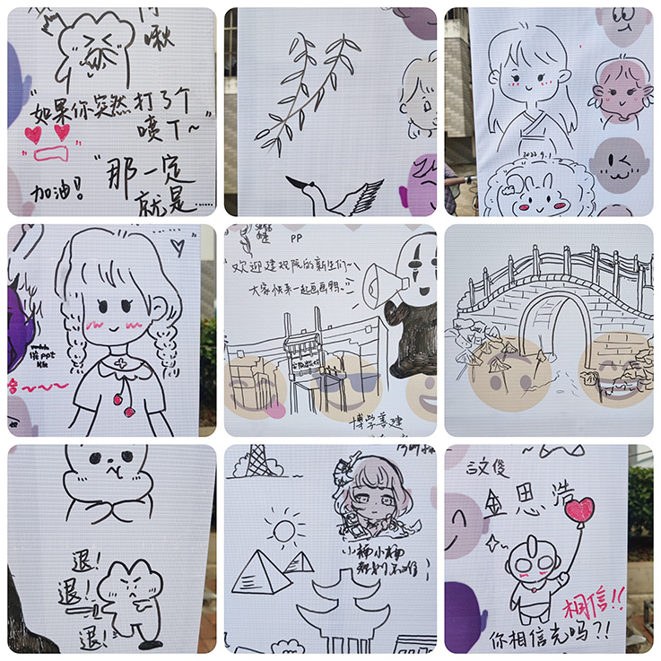 建规手绘签到墙,给新生一个展示自己特长的平台。每一个手绘的卡通形象都展示着新生丰富的想象力、无限的创造力、扎实的手绘功底。“你一笔,我一笔,绘制建规大家庭!”