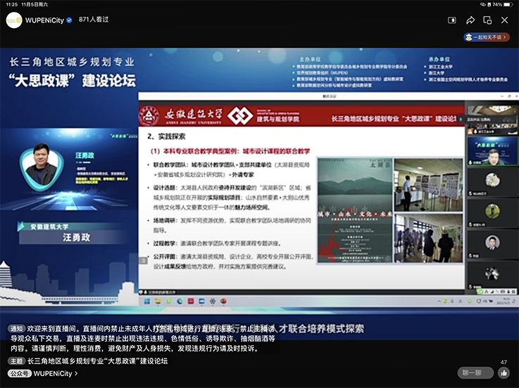 本网讯 2022年11月5日上午,长三角地区城乡规划专业“大思政课”建设论坛在杭州顺利举行。本次论坛是响应教育部《全面推进“大思政课”建设的工作方案》,推进建设“大课堂”、搭建“大平台”、建好“大师资”的有益尝试和创新探索。