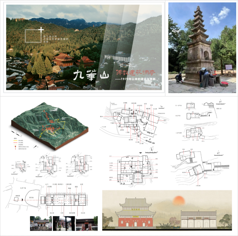 我院学生作品《九华山佛教建筑调查——1979年后的建设与更新》,对1979年以来九华山佛教建筑的变迁进行了调查研究。在回顾以往研究文献的基础上,对九华山八座规模较大的寺庙和九华街进行现场调研和测绘,分析了这些建筑经过四十余年建设更新带来的变化及其主要特征,并对九华山民居式和宫殿式两种基本类型建筑空间布局、平面和立面形制进行比较。报告关注建筑遗产的历史变迁,具有明显的问题意识和学术取向,拓展了测绘调研的视野和范围,获得了竞赛专家评委会的一致认可。(图文:万智康,牛婷婷;审核:唐劲松)