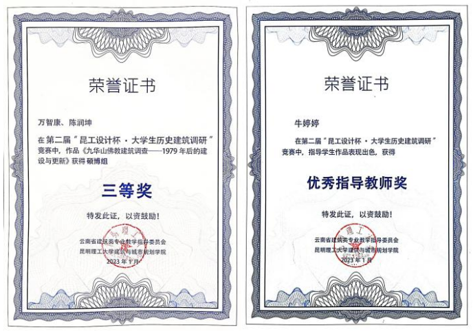 近日,第二届“昆工设计杯·大学生历史建筑调研”获奖名单发布,建规学院万智康、陈润坤同学的作品《九华山佛教建筑调查——1979年后的建设与更新》,获竞赛硕博组三等奖,牛婷婷老师获优秀指导教师奖。