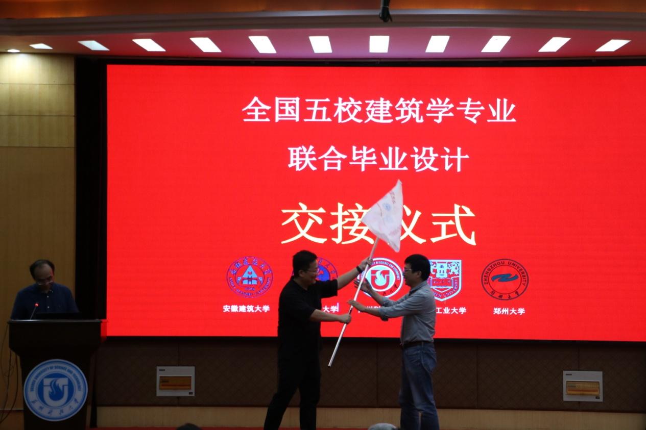 最后由我校建筑系许杰青主任、南工大建筑学院原院长胡振宇教授分别作了总结发言。许杰青主任表达了对五校联合毕业设计的七年成就的赞誉以及对明年第八届联合毕设的期许,并表示在座的各位同学在今天的终期答辩中都展现出最好的风采。最后许杰青主任向苏科大建筑系刘长春主任交接了下一届联合毕设承办会旗。