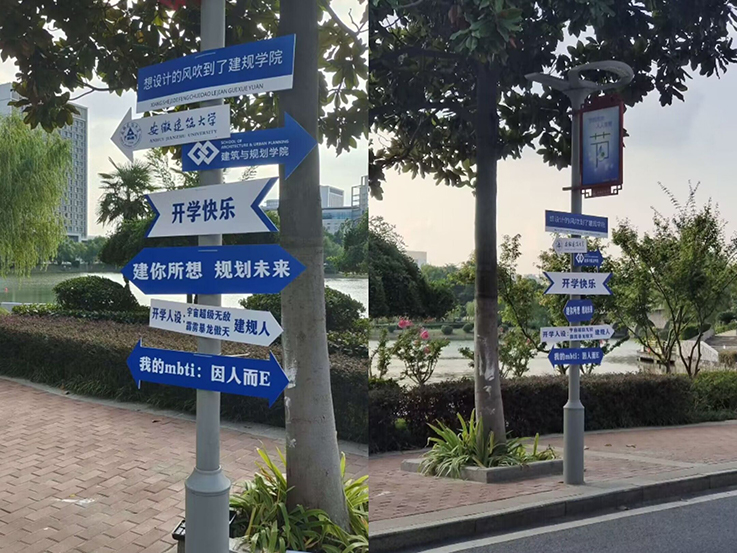“想设计的风吹到了建规学院”“建你所想 规划未来”“开学人设”“我的mbti”一句一句创意导视牌的导视语,引领学子进入建规大家庭。