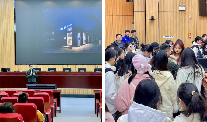 陈宇威先后向同学们分享了自己在作为建筑师、咖啡师、旅行者的不同时期的有趣经历,以及在这些时期的一些收获与感悟。在介绍自己的建筑师阶段时,他为我们讲述了自己的工作经历以及在工作期间留下的遗憾,后来创立多家连锁咖啡馆的他,也保留着建筑师的习惯,咖啡馆外观以及馆内文创产品的设计皆出自他的构思规划,为城市传递着平凡的活力。在作为旅行者的时期,那颗心系建筑设计的有趣灵魂仍未泯灭,在不同城市进行citywalk,观察不同城市的建筑并进行思考。
