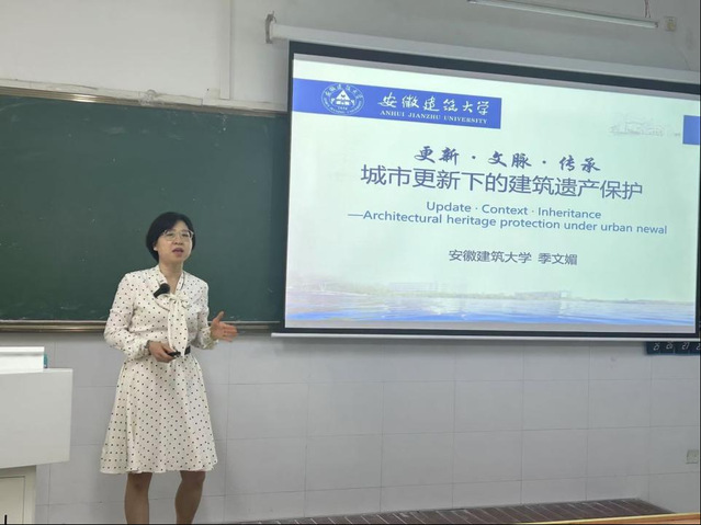在当下城市更新中,如何合理保护城市文脉,再利用建筑遗产,适度文旅开发,成为学界关注焦点。季文媚教授作为安徽省文物保护专家,在讲座中与师生们分享了她的研究成果和实际案例,为与会师生开拓了视野。