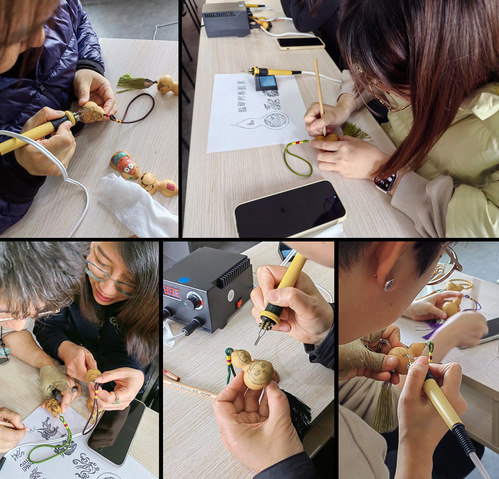 在实践环节,姚瑶带领师生们亲手体验葫芦烙画制作。从选材、构图到控温运笔,她逐一示范指导,强调“心静、手稳、意专”的匠人精神。参与师生在素色葫芦上勾勒出各种图案,细腻的线条逐渐在烙笔下成型,春日的生机与传统文化的深邃跃然于方寸之间。建筑系教师表示:“烙画的过程让我体会到传统工艺对细节的极致追求,这种专注力对专业设计也深有启发。”