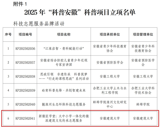本网讯 近日,安徽省科学技术协会公布了2025年“科普安徽”科普项目立项名单,由我校建规学院牵头申报的“新徽匠学堂:大中小学一体化的徽派建筑文化传承志愿服务”项目成功入选科技志愿服务品牌活动。这也是继2024年我校获批“安徽省中华优秀传统文化传承基地”和“安徽省社科普及优秀典型案例”后,在徽派建筑文化传承领域获得的又一殊荣。