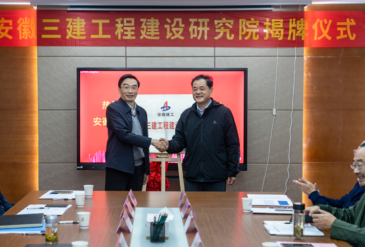 11月17日,校党委书记孙道胜应邀率队参加安徽三建工程建设研究院揭牌仪式,安徽建工集团控股有限公司党委委员、副总经理、总工程师戴良军,安徽三建工程有限公司党委书记、董事长何洪春接待了孙道胜一行。孙道胜、戴良军共同为研究院揭牌。
