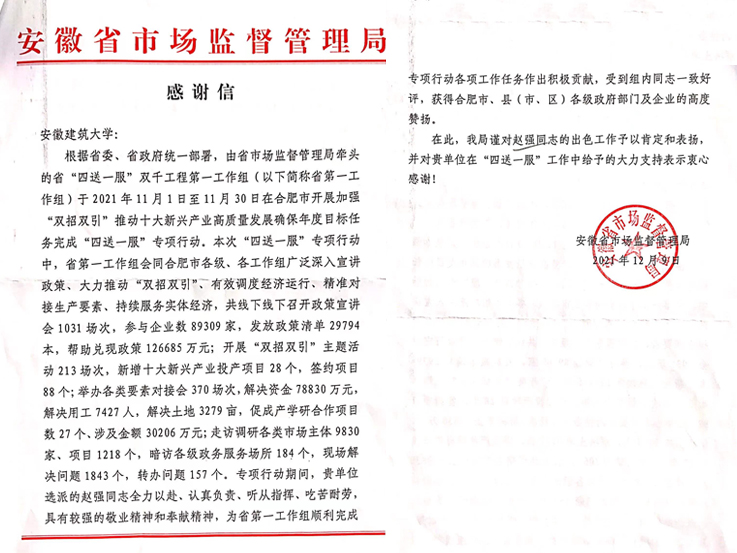 本网讯 近日,安徽省市场监督管理局就我校“四送一服”双千工程工作发来感谢信,对我校给予省“四送一服”第一工作组的支持表示感谢,对我校选派的谢发之、赵强两同志表示高度认可。他们全力以赴、认真负责、听从指挥、吃苦耐劳,具有较强的敬业精神和奉献精神,为省第一工作组顺利完成专项行动各项工作任务做出积极贡献,受到组内同志一致好评,获得合肥市、县(市、区)各级政府部门及企业的高度赞扬,工作组为此向学校发来感谢信。