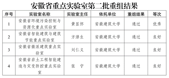 本网讯 近日,安徽省科技厅公布了第二批安徽省重点实验室重组评审结果,我校“安徽省环境污染控制与资源化重点实验室”、“安徽省智能建筑与建筑节能重点实验室”、“安徽省徽派建筑重点实验室”和“安徽省岩土工程智能建造与灾变防控重点实验室”等四个安徽省重点实验室全部通过重组,其中安徽省环境污染控制与资源化重点实验室获评“优秀”等级,另三个实验室获评“良好”等级。