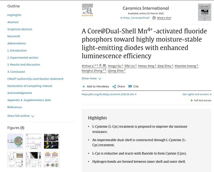 研究团队针对白光LED器件的发光材料存在的问题,提出了一种环保高效的表面处理策略,通过使用廉价的含巯基有机化合物 L-半胱氨酸(L-Cysteine)与荧光粉反应,在其表面构建了双壳结构保护涂层。研究表明这种双壳结构使制备的KSFM荧光粉具有显著提高的耐水性,在去离子水中浸泡10小时后仍能保持初始发光强度的97.5%,其发光性能也得到增强,最大内部量子效率(IQY)超过96%,相关技术参数接近GE(通用)公司同类产品。这种具有双壳结构的Mn⁴⁺激活氟化物的优异性能,使其在WLED中的应用更加可靠。(图/文:谷永毅 ;一审:李新化;二审:杨亚龙;三审:张润梅)论文链接:https://www.sciencedirect.com/science/article/pii/S0272884225005127