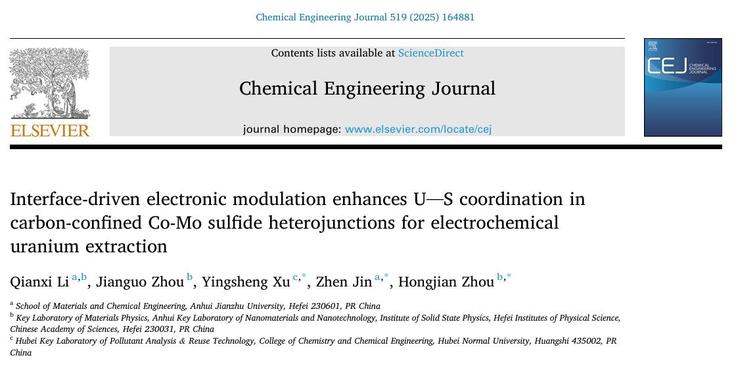 本网讯 近日,我校金震副研究员与中国科学院合肥物质科学研究院周宏建研究员联合指导的硕士研究生李千禧在化学工程领域国际顶级期刊《Chemical Engineering Journal》(IF=13.3,中科院一区TOP)发表题为《Interface-driven electronic modulation enhances U-S coordination in carbon-confined Co-Mo sulfide heterojunctions for electrochemical uranium extraction》的重要研究成果,充分展现了两单位在科研协同创新方面的显著成效。