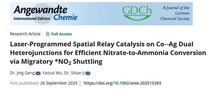 电催化硝酸盐还原合成氨被视为一种兼具废水处理与绿色氨生产潜力的可持续技术,然而其实际应用受限于缓慢的反应动力学以及析氢副反应的竞争。针对上述问题,本研究提出一种创新性的激光编程空间接力催化策略,通过调控迁移性*NO2中间体在钴-银双异质结结构中的动态传输过程,显著提升硝酸盐向氨转化的效率与选择性。