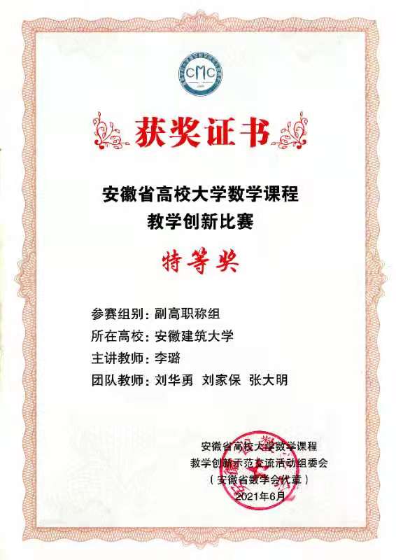 本网讯 数理学院李璐老师在近日举行的安徽省高校大学数学课程教学创新比赛中荣获副高职称组特等奖,并被推荐参加11月份举办的首届全国高校大学数学课程教学创新示范交流活动。