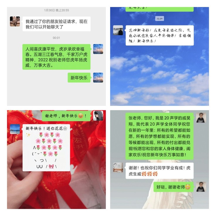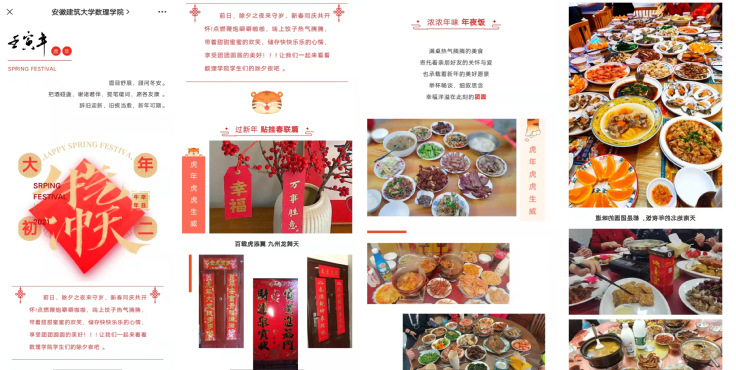 除夕夜,同学们通过QQ、微信短信等学院领导学业导师、辅导员等教育工作一线辛勤付出的老师们送上节日的祝福,通过诚挚的祝福,表达对老师一年辛勤培育的感谢,进一步增进师生之间的感情。大年初一,师生们通过录制新春祝福视频表达出对新年的美好期望,学院易班工作站全院同学开展年味照片征集活动通过照片中和睦团圆的全家福,丰盛可口的年夜饭,贴春联、写福字等照片向大家展现不同地方的不同风俗习惯,每一张照片都表出了大家对于辞旧迎新,家人团聚的欢乐同时也传递出大家对新一年美好生活的向往