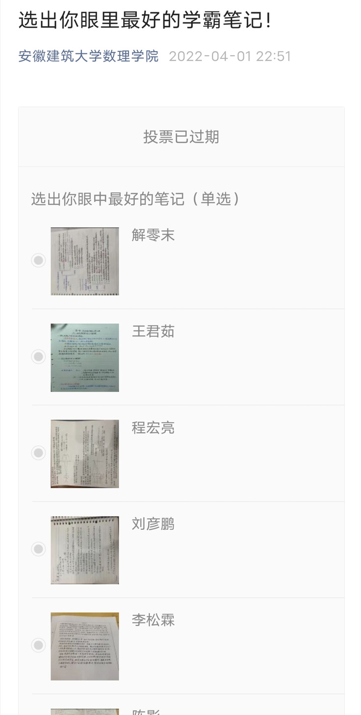 本网讯 为进一步提高同学们的自律意识,营造优良学风,激励同学们互学互促、共同成长,发挥朋辈互助作用。数理学院于4月1日-5日在线上开展“笔记于行,学实于心”学霸笔记评选活动,最终评选结果于4月5日晚投票结束后,由工作人员统计得出。