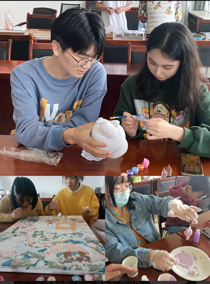 本次活动参与的形式不限,同学们可利用不同种类的材料进行制作,有DIY流体熊设计、DIY手工帆布包设计、DIY拼图设计等。DIY手工帆布包设计:参与者在空白的帆布包上设计自己的专属图案,多人共同参与协作,相互比较共同寻找灵感。DIY拼图设计:多人共同参与拼图,分别完成一千片国画《清明上河图》和油画《星空》拼图,持续四个小时的拼图极大考验大家的耐心和细心,成就感满满!DIY石膏娃娃彩绘,油画DIY填充手绘,多人协作完成油画板颜料填充,讲究大家的分工与配合,考验默契的同时也考验个人的细心。