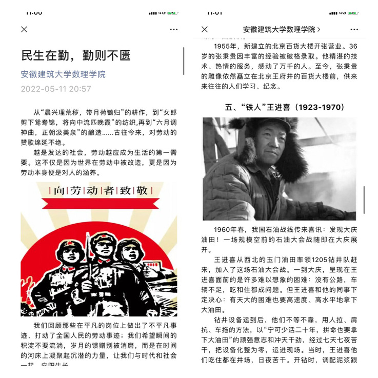 学院利用易班、微信公众号开展“民生在勤,勤则不匮”致敬劳动模范宣传活动,引领学生共同向劳动模范致敬,聆听劳动模范故事,感受领悟勤勉敬业的劳动精神,争做新时代的奋斗者。
