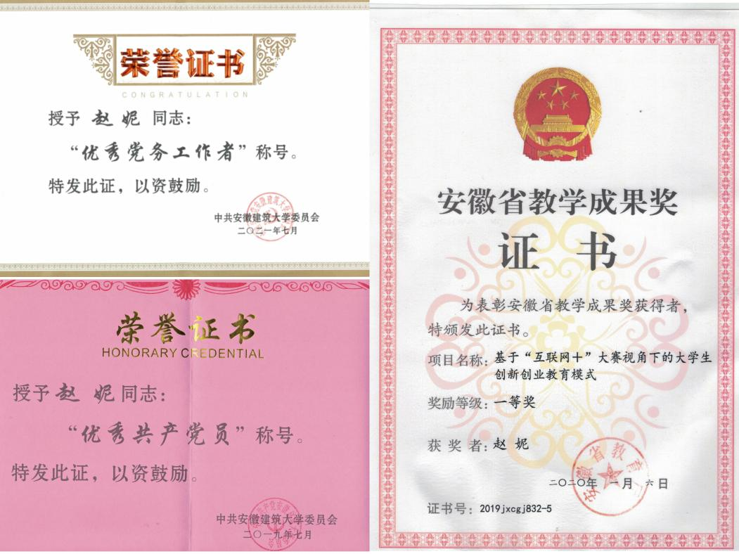 近三年来,党支部书记赵妮曾先后荣获安徽省高校优秀党务工作者荣誉称号、安徽省优秀共青团干部荣誉称号,安徽省教学成果一等奖,校级优秀共产党员和校级优秀党务工作者荣誉称号。