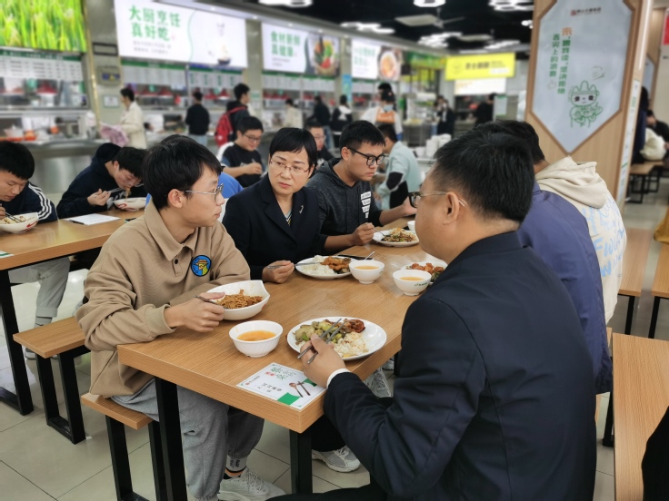 食堂里,王玉兰与数理学院学生一起共进午餐。王玉兰询问了同学们关于学习、生活、专业培养等方面的情况,倾听学生们的困惑与问题,并耐心讲解。同学们积极主动交流想法。现场气氛温馨融洽。