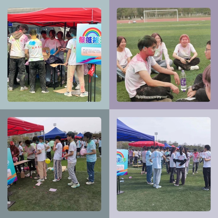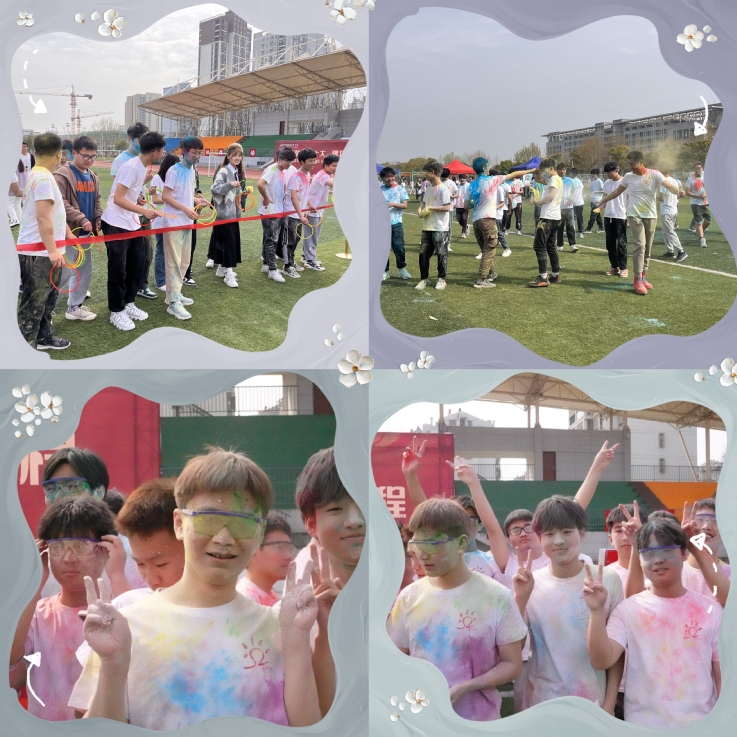 学院院长戈慈水吹响起跑哨,同学们奋力向前冲刺,彰显青春活力,在领跑员的带领下,同学沿着校园五个彩虹站点向终点奔去,经过彩虹站时,工作人员向同学们喷洒彩虹粉,为大家送去幸福安康、健康快乐的祝福,到达终点后,同学们开启了互撒模式,每个人身上都沾满了彩虹的颜色,脸上都洋溢着喜悦的笑容,大家纷纷在告白墙上留下自己对未来的期许。