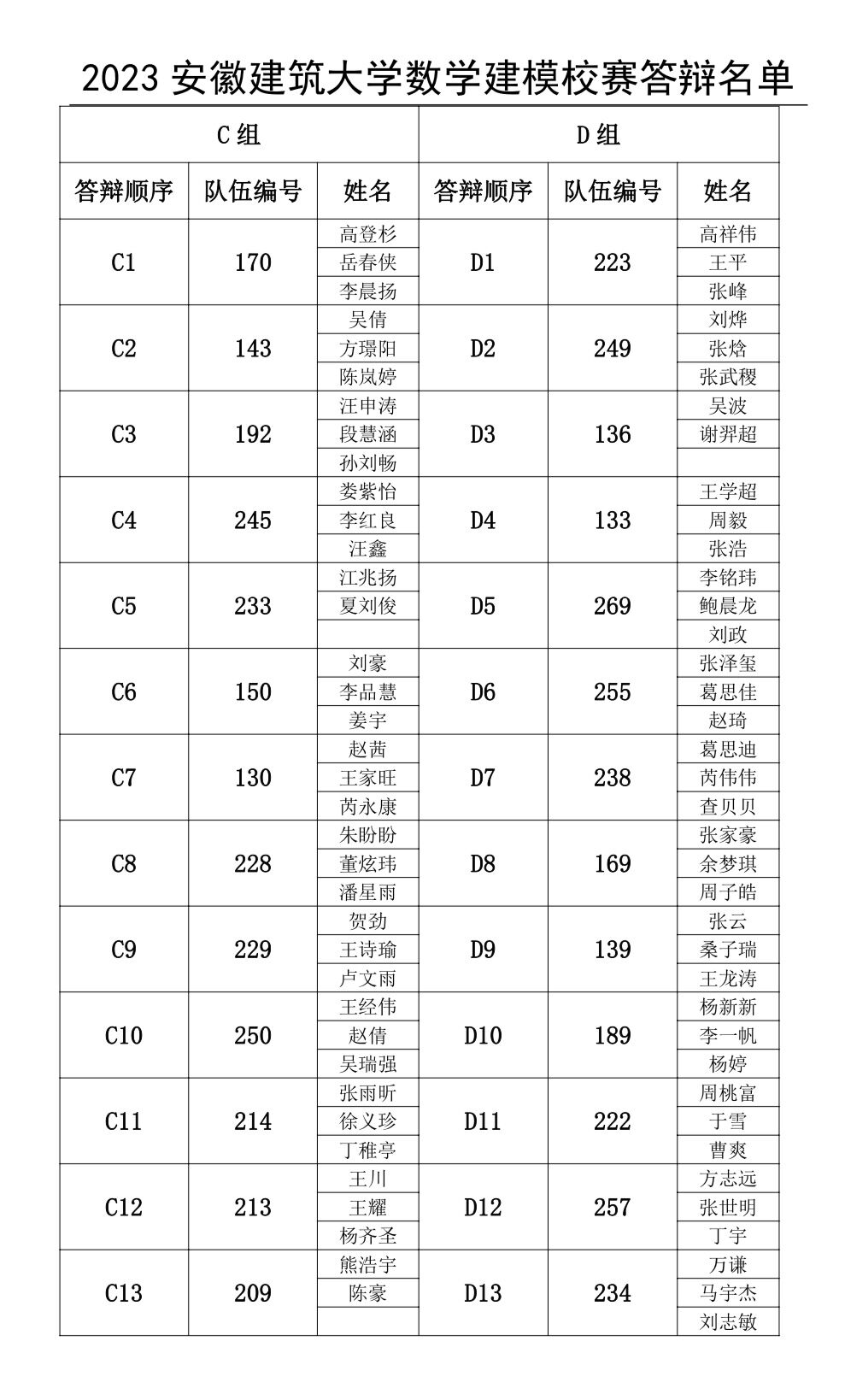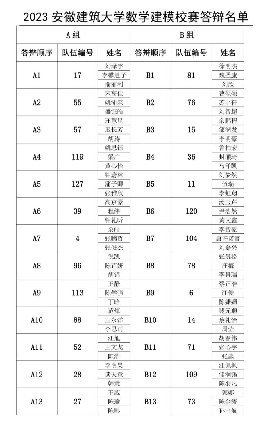 2023年数学建模竞赛校赛论文盲审评阅已经结束,共有125队成功提交作品。本次竞赛设奖比例约为60%:一等奖12组,二等奖28组,三等奖40组。根据论文评阅结果,52组同学需参加现场答辩角逐一二等奖,论文和答辩综合成绩决定校赛最终的获奖等级。本次答辩安排在5月10日下午3:00,现将答辩名单和答辩分组情况,详情如下: