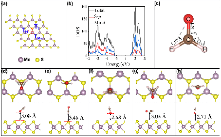 甲醛是一种室内有害气体,也是肺癌患者的呼吸标志物,吸附和检测具有重要意义。本征MoS2为范德华层状结构,具有化学惰性,难以用于甲醛的吸附和检测。高娅雯等基于第一原理计算较为系统研究了缺陷MoS2对甲醛的吸附和气敏性质。研究在MoS2单层中引入硫空位和过渡金属原子等多种缺陷,计算分析了这些缺陷的原子结构、电子结构和形成能等。以此为基础,研究进一步考虑了不同缺陷情况下甲醛气体的吸附,对每种情况,计算了甲醛分子的吸附能,以及吸附前后的体系态密度、电荷转移、电荷密度差等,并据此对各种情形下材料对甲醛气体的吸附和气敏性质进行了讨论分析。