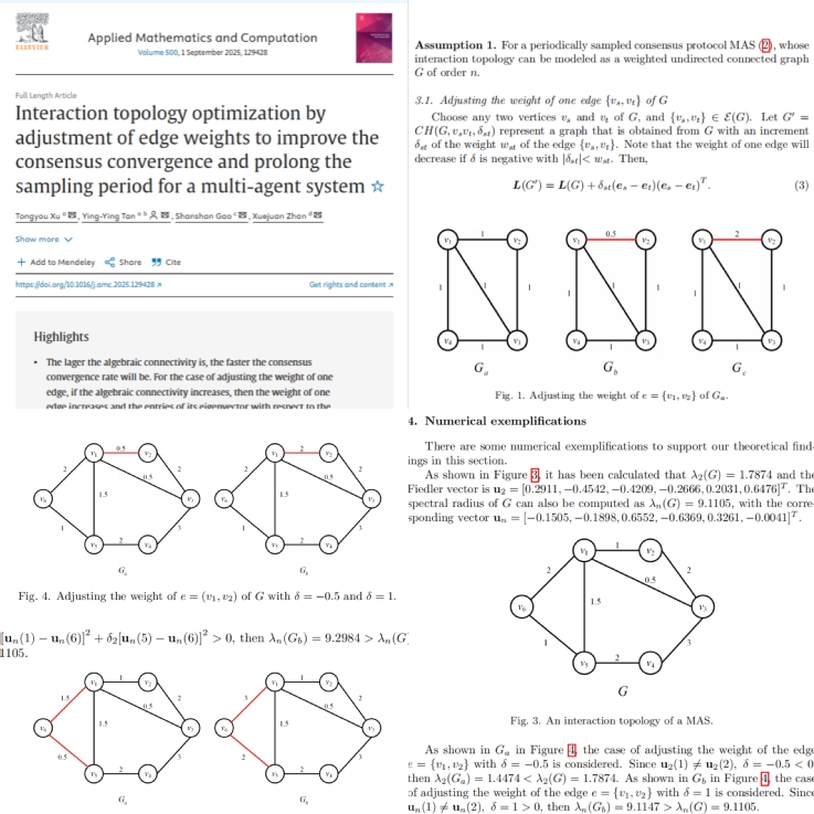 研究团队依托校级科研平台运筹学与数据科学实验室,着重攻克多智能体系统的一致性难题。多智能体系统由众多智能体构成,凭借局部协同与相互作用来执行复杂任务,在无人机编队、智能交通、分布式传感器网络等领域应用日益广泛。其中,一致性问题尤为关键,它基于局部信息交互,目标是让所有智能体状态快速趋于一致,这直接关系到多智能体系统的资源利用率。针对多智能体系统的通信拓扑图,团队提出一种边权调整运算方法,给出了代数连通度增大和谱半径减小的必要条件,代数连通度的增大能够加快一致性收敛速率,而谱半径的减小则有助于延长采样周期。这一成果不仅为提高多智能体系统的资源利用率提供了新的理论依据,也为无人机编队、智能交通等领域的技术创新提供了有力支撑。(作者:谭莹莹;一审:水天柱;二审:刘华勇;三审:胡燕青)