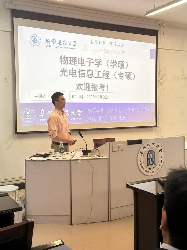 本网讯 为加强研究生培养质量和校际学术交流,5月9日,数理学院光电信息工程学科点负责人徐金荣副教授,赴阜阳师范大学物理与电子工程学院开展光电信息工程与物理电子学专业研究生招生宣传工作。阜阳师范大学物理与电子工程学院党委书记吴学军主持宣讲会,学院相关专业师生代表参加此次活动。