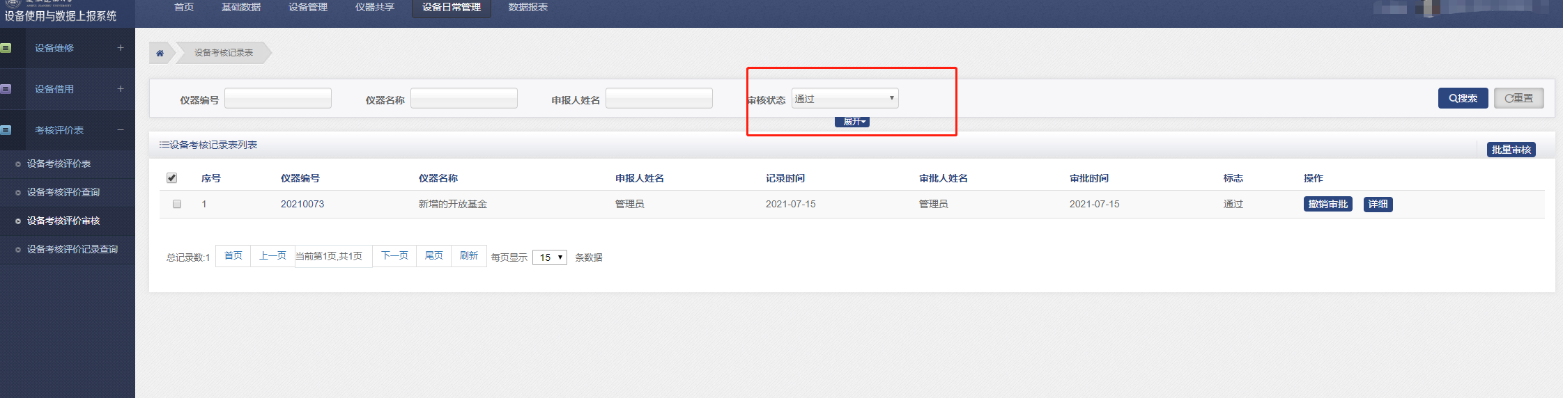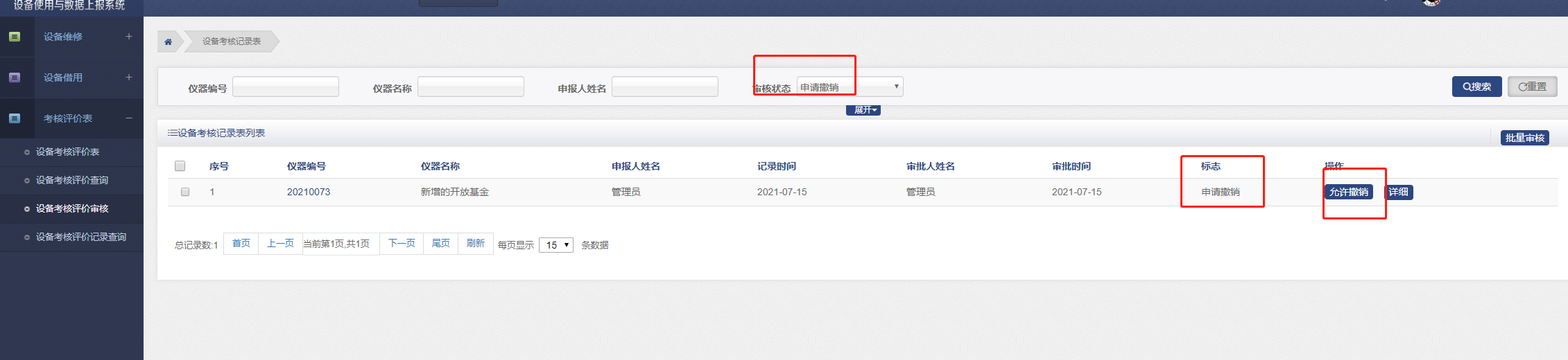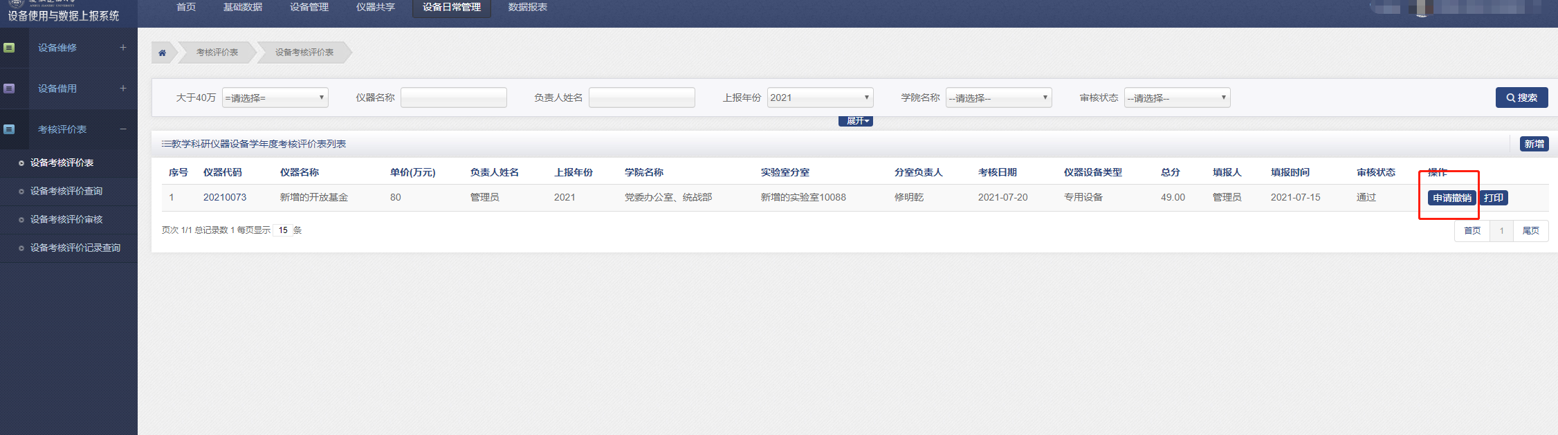 此处可执行撤销审批操作,撤销后,设备考核评价表可继续修改。