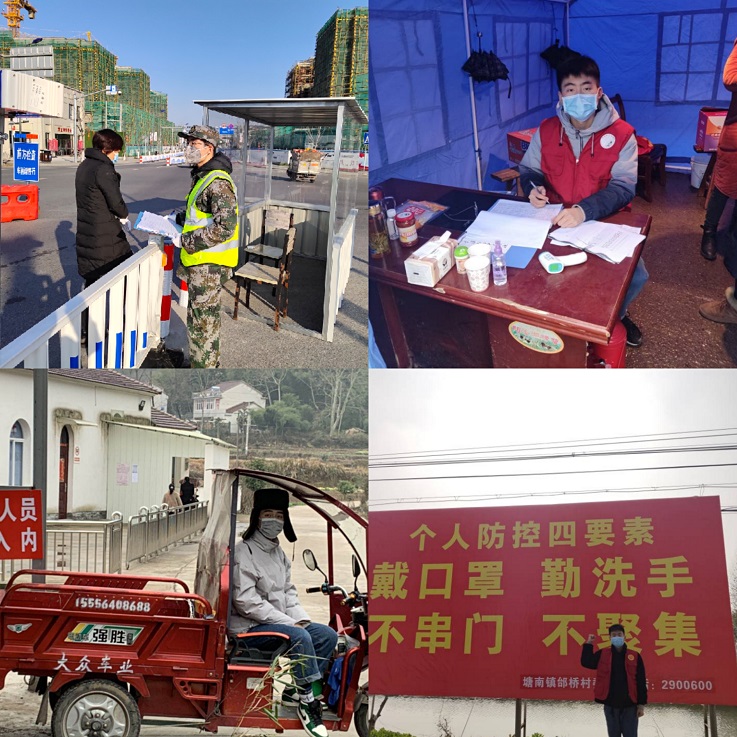 新青年,担使命 新青年,担使命。土木学院也有走出家门,投身于这场无硝烟的战争中的青年学子。19级土木2班班长张文旭于1月30日起参与到安徽当涂县塘南镇邰桥村的疫情防控志愿服务中,每天下午6点到晚上10点对来往的车辆进行检查登记,对外来车辆进行劝返。“在此次志愿者活动中,我感受到了国家对疫情的重视,以及大家为此付出的努力。众志成城,我会继续努力,尽自己的一份绵薄之力。中国加油!”张文旭如是说。 战“疫”第一线,上阵“父子兵”,也有学子和家长在筑牢疫情防控战线中并肩作战。17级安全1班孟志超的外公是安徽舒城县南港镇沙埂河西村新利生产队队长,坚守在防控疫情第一线。孟志超便协助外公为每家每户分发防范疫情倡议书,和外公轮流在车辆阻拦点执勤。17级安全2班沈易成和作为社区工作人员的妈妈为这场防控疫情阻击战做着自己的努力,在浙江嘉善县陶庄镇陶庄路口第一卡点站岗执勤。当问起他为什么要参加这个志愿活动时,他回答得很朴实,“我觉得我可以为对抗疫情出一份力,增援人员不足的情况。”