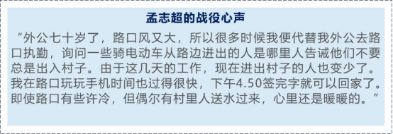 18级土木工程专业二班王礼龙主要在村庄路口拦截与检查过往的车辆,并检测进出人员的体温情况后进行详细的记录,同时为近期回到工作岗位的职工们发放相关证明。王礼龙同学表示工作虽辛苦,但他却感觉无比的充实幸福。