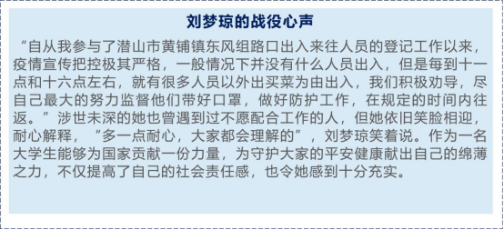18城市地下空间工程专业的刘梦琼从正月初二开始就帮助母亲登记需要购买感冒药、发热药物人员的工作,每天整理信息并反馈到上级指挥部门。后来,她又加入到路口登记员的队伍中,负责出入来往人员的身份核查和登记工作。