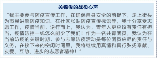 在疫情暴发后,19级土木工程专业四班的关锦俊一直密切留意着义工联合会发布的义工招募信息,当志愿防疫招募信息发布时,他毫不犹豫地报名加入。在此之前,他一直是江门市的注册义工,经常积极参加各类义工活动,并多次受到市义工联合会的表彰,因此在这次防疫志愿活动中,他也希望通过运用之前积累的经验为市民服务。