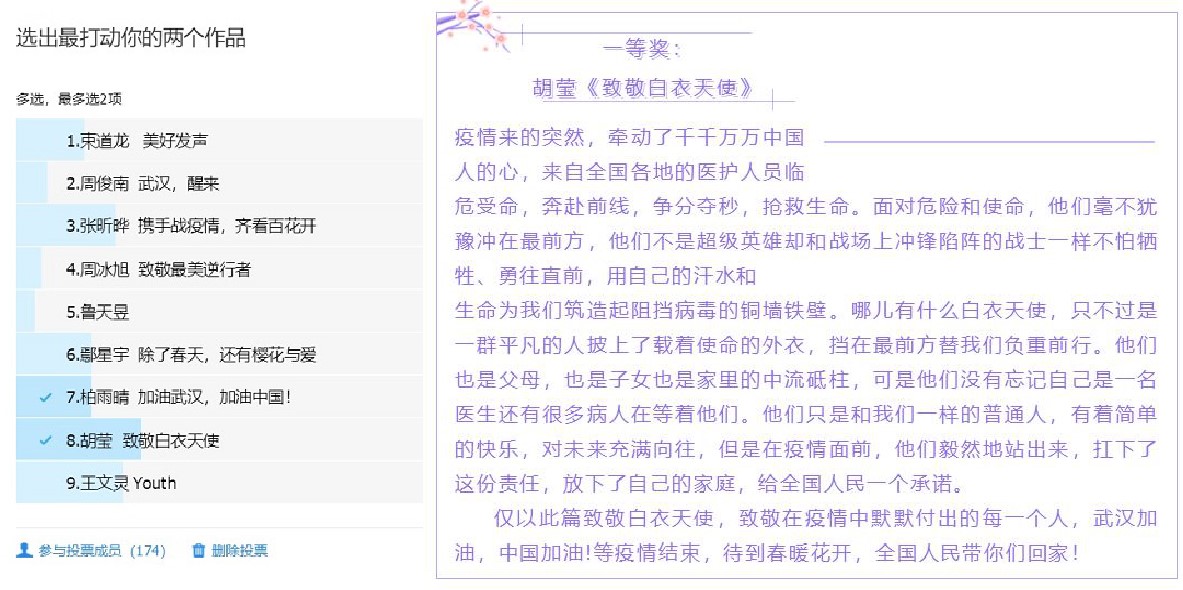 本次活动采取了线上收集音频方式,自音频收集渠道开通以来,同学们积极参加。有的同学用慷慨激昂的演讲致敬最美逆行者;有的同学用意涵丰富的诗歌抒发对“武汉醒来”的美好期望;有的同学用优美凝练的散文展望了“除了春天,还有樱花与爱的美好情景。经过初选,共有9个作品进入决赛,同学们仔细聆听选出了最打动人心的作品,最终18测绘专业的胡莹同学以她的作品致敬白衣天使获得了本次比赛的一等奖。