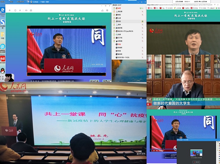 本次思政大课邀请了时代楷模、大连海事大学马克思主义学院教授、教育部思想道德修养与法律基础课教学指导委员会副主任委员曲建武,安徽援鄂抗疫医疗队总领队、安徽省血吸虫病防治研究所所长、主任医师汪天平,安徽中医药大学马克思主义学院院长、教授董玉节,合肥师范学院副院长、教授姚本先,中共安徽省委党校(安徽行政学院)马克思主义学院院长、教授汪兴福,作为主讲嘉宾。课程中,主讲老师们结合疫情实际,讲述感人故事,分析疫情彰显的中国共产党领导和中国特色社会主义制度的显著优势,引导广大青年学生正确认识和看待此次战“疫”。通过学习,同学们纷纷表示,在这个牵动所有国人的春天里,我们也要努力为社会做出贡献,不随便出门,戴好口罩,加强锻炼,调整情绪,认真上好每一堂网课,并结合课程内容与自身实际认真写下观后感。