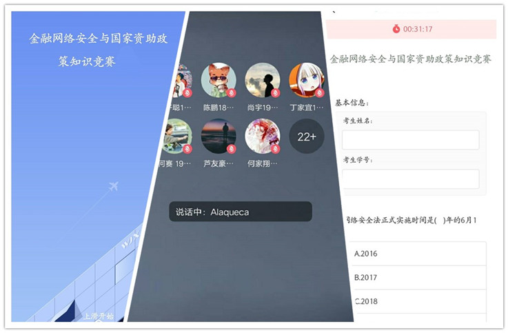 本次比赛在网络小程序上进行,参赛选手需先进行网络报名并在规定时间内完成作答。本次竞赛中,参赛选手通过运用日常生活中的积累以及赛前在网络或书籍上了解到的关于金融网络安全和国家资助政策的知识进行了沉着而又自信的作答,展现了他们渊博的知识储备以及良好的赛前准备竞赛过程中,选手们表现出了很高的积极性竞赛伊始便沉浸到作答的状态中。比赛中,选手们严格遵守诚信作答的原则,展现出了自己的竞赛素养。本次比赛将金融网络安全和国家资助政策有关知识带进了学生中间,是我院诚信教育活动的重要内容,提高了同学的总体金融网络安全意识水平加强了同学们关于国家资助政策实施的了解。(图/文:王月竹 陈鹏 丁家宜 ;审核胡燕青