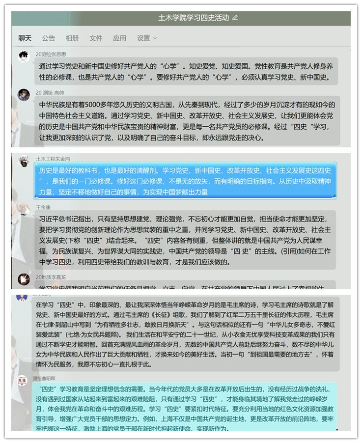 同学们在线上通过观看视频、阅读相关资料书籍的方式学习“四史”。在本次活动中土木学子们进一步领悟了爱党爱国、爱校荣校的精神,纷纷写下了自己的所感所得。同学们表示自己深切的体会了中国共产党在革命奋斗中的艰难历程,深刻的了解中国共产党为了实现中华民族伟大复兴的中国梦的历史使命。学习“四史”,帮助同学们建立了正确的世界观、人生观、价值观,成为有信仰、有理想,有担当的时代青年。