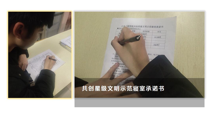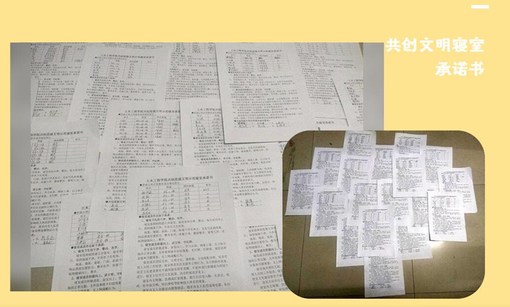 活动伊始,各寝室积极签订共创星级文明宿舍承诺书。他们纷纷表示在承诺书上签下自己名字的那一刻起,就立志携手室友,打造一个具有高雅清新的室内部署,整洁干净的内务卫生,文明科学的生活习惯,勤俭节约的生活作风,安静宜人的学习环境的寝室,让宿舍真正成为自己在大学四年的家。