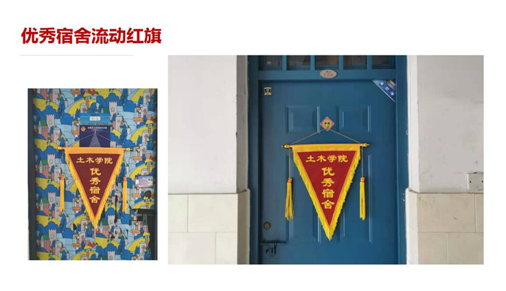 “星级文明寝室”评比,以土木学院每周三晚例行查卫生为基础,每周最优寝室将配挂“最优宿舍”流动红旗一周。评比末期对所有寝室进行综合评分,评出三个等级,对活动内综合表现优秀并通过最终检查的寝室颁发星级牌。相信在所有室友的共同努力下,土木学子的寝室一定会成为陪伴他们四年的一个温馨、卫生、整洁、舒适的家,土木学院的寝室文明创建工作也会前进一大步!(图/文:王月竹 孙兴涛;审核:胡燕青)