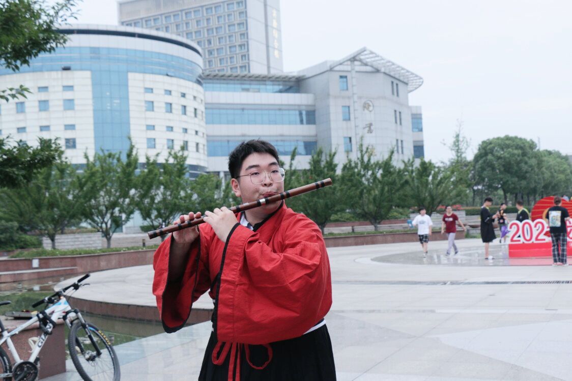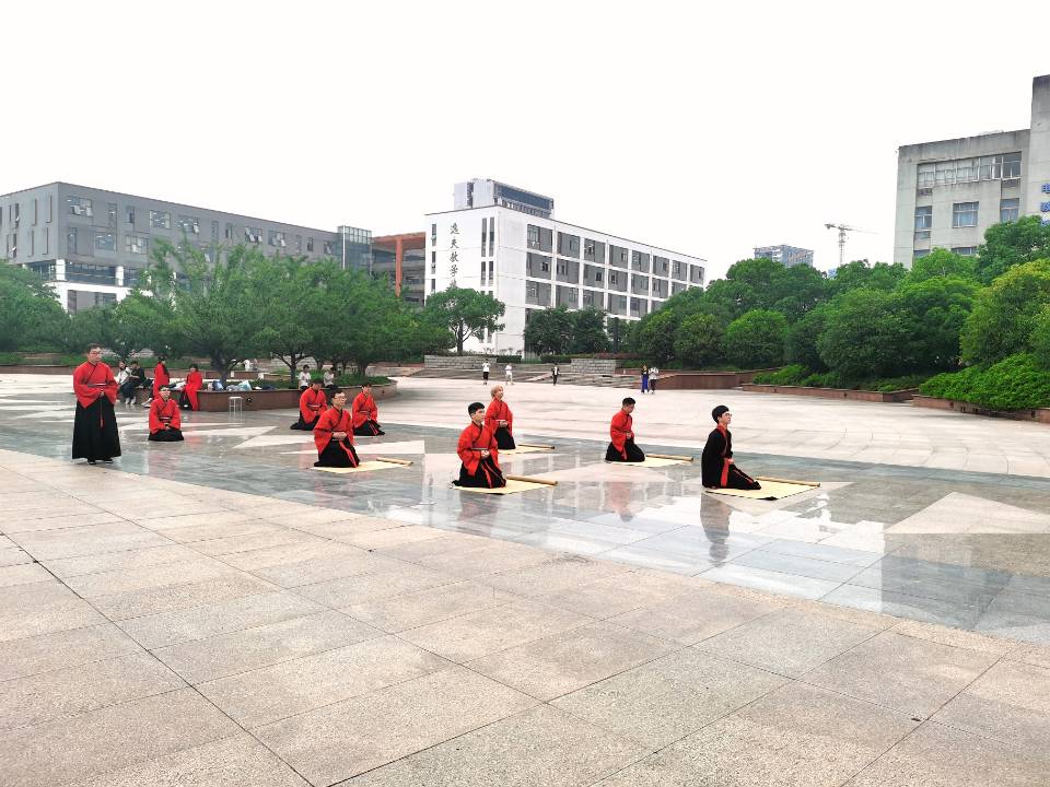 随着庄严的乐曲响起,土木学院衿易社的同学身着朱红汉襦,踏着庄重的步伐款款走来,净手、整衣冠、肃面容、上香、奉酒、献花果、坐、拜、起……现场一声声乐音不绝于耳,往来之学子皆有所感触,驻足相望。又一铿锵有力之声响起,朗诵俱乐部的同学开始吟唱《离骚》,重演古人为国奋斗之情景。伴随着飘扬的红裙和悠扬的笛声,活动缓缓落下帷幕。