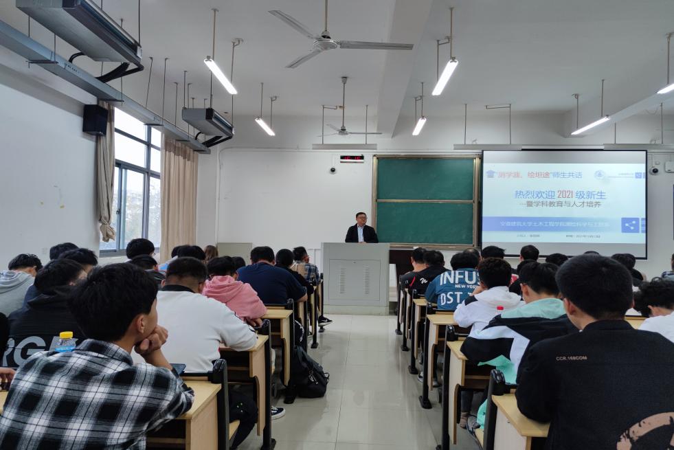 会上,施贵刚首先对全体同学成为测绘一员表示热烈的欢迎和诚挚的祝福。接着,就学科与专业体系向在场学生作了介绍,从学科体系的研究方向、本科院校及学科奠基人到专业体系的培养目标、办学定位及师资结构等,讲解全面而有深度。在此基础上,施贵刚也将土木学院测绘科学与工程系教师队伍一一引荐给大家,并针对当前教学保障以及人才素质和就业目标展开阐述。