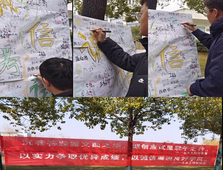本网讯 “沉着答题露文曲之华,诚信应试显君子之行”。为了严肃考风考纪,加强大学生的诚信教育,提高同学们诚信应考的意识,近日,土木学院各班级召开了主题班会,学院举办了“诚信应考,杜绝作弊”诚信考试签名活动。