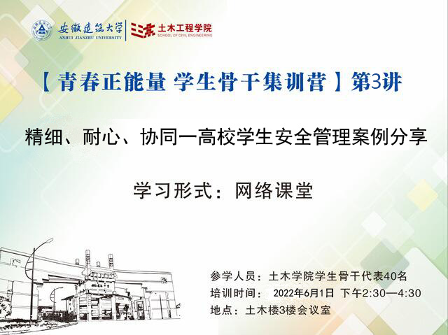 编者按:今年是党的二十大召开之年,也是共青团建团100周年,为深入贯彻落实习近平总书记关于青年工作重要论述精神,进一步强化青年学生的思想引领,切实将青年工作抓实、抓细、抓具体、抓出成效,土木学院特推出“青春正能量 学生骨干集训营”专题培训活动,旨在搭建青年学生骨干学习、锻炼、展示平台,通过抓好“关键少数”带动“绝大多数”,教育引导广大学生增强中国特色社会主义道路自信、理论自信、制度自信、文化自信,高扬理想风帆,厚植爱国情怀,把爱国情、强国志、报国行自觉融入到实现中华民族伟大复兴的奋斗中,以一往无前的姿态展现土木学子风采,喜迎党的二十大胜利召开。