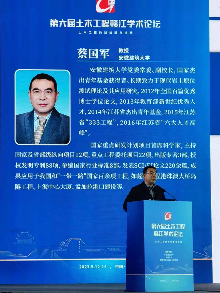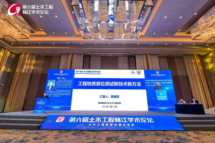 大会聚焦“土木工程的新机遇与挑战”这一主题,深入探讨土木工程发展面临的新问题,积极寻求解决思路,助力我国土木行业向绿色化、智慧化、韧性化转型发展。我校蔡国军教授以《工程地质原位测试新技术新方法》为题作大会特邀报告,在报告中,基于地震波触探的地基土动力特性评价方法以及基于电阻率触探的污染土评价方法等多方面介绍了多功能岩土工程CPTU原位测试系统,同时介绍了研究成果在现场的应用情况,并宣传介绍了第一届国际岩土工程原位测试论坛。