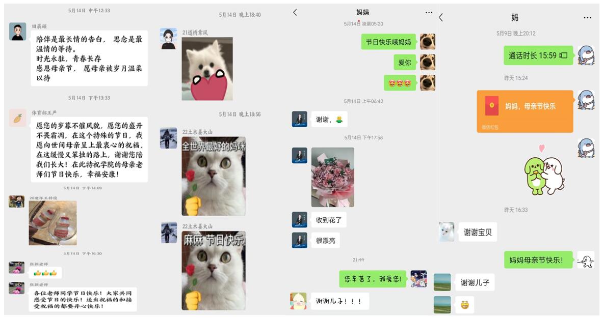 致敬母爱 祝福暖心 活动中,同学们通过微信、短信等方式给自己的母亲发送祝福,表达对母亲的感激和爱,并将截图发在班级群里,与同学们分享。同时,同学们还在群里祝福土木学院所有已为人母的老师们节日快乐,感谢她们在学习和生活中给予的帮助和关怀,她们是学生们的另一个“母亲”,另一个姐姐!