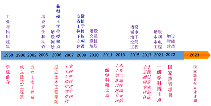 专业历史悠久。1958年9月毛泽东同志视察合肥,提出“有大希望”,随即为支援安徽建设,根据国家建筑工程部的指示,1958年9月组建安徽建筑工程学校,首批开设工业与民用建筑(我校土木工程专业前身)、硅酸盐两个专业。