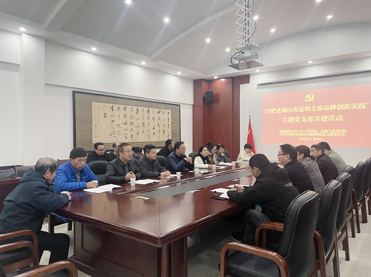 本网讯  为深入学习贯彻习近平新时代中国特色社会主义思想,以共建促党建、以党建促发展,充分发挥基层党组织的战斗堡垒作用,1129日下午, 土木学院建筑工程系、建规学院景观系教工党支部与合肥市逍遥津公园管理处下属支部开展以“合肥老城区改造和文旅品牌创新实践”为题的党建共建活动。土木工程学院党委书记王媛、建筑规划学院党委书记唐劲松、副书记吴梦东、建工系教工党支部和景观系的党员同志参加活动。逍遥津公园管理处书记胡从容及下属4个党支部的书记和党员参加了活动。