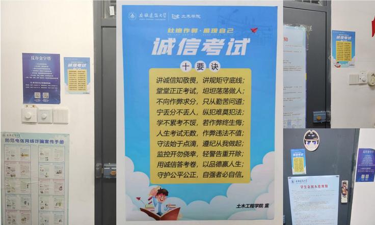 为营造考试诚可贵,诚信价更高的氛围,学院通过微信公众号、易班、学生宿舍贴宣传标语等多种方式进行宣传教育。微信公众号及易班推文“您有一份新的考试纪律指南请查收”、“致全体在校生及家长的一封信”等详细介绍了诚信考试的重要性及作弊的严重后果,引导学生树立正确的考试观念。学生宿舍里张贴“诚信考试宣传单,时刻提醒学生们遵守考试纪律。通过这些措施,诚信考试的理念已经深入人心,成为校园内的一道亮丽风景线。
